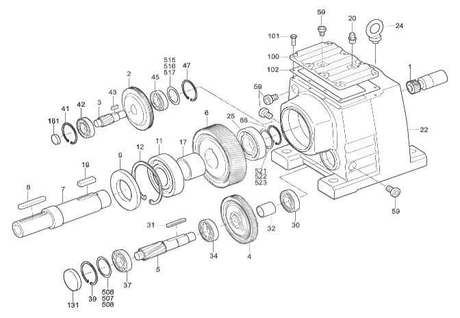 | 3 Вал-шестерня | 22 Корпус редуктора | 45 Подшипник качения | 515 Установочная шайба |