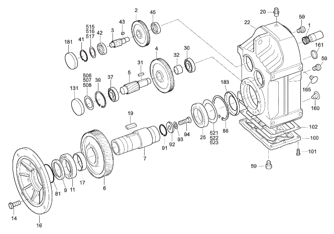 | 1 Шестерня малая | 22 Корпус редуктора | 91 Стопорное кольцо | 506 Установочная шайба |
