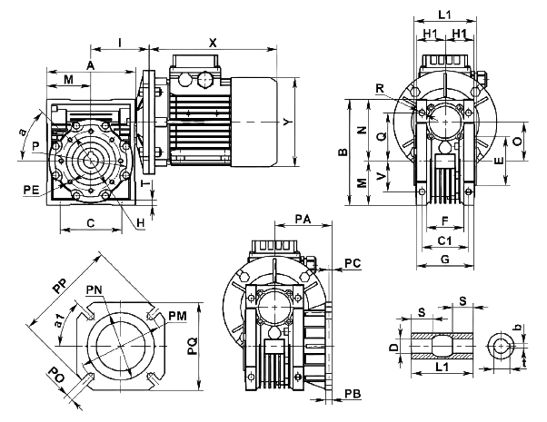 | NMRV | S | T | V | PA | PB | PC | PE | PM | PN(H8) | PO | PP | PQ | b | t | a | a1 | кг |
